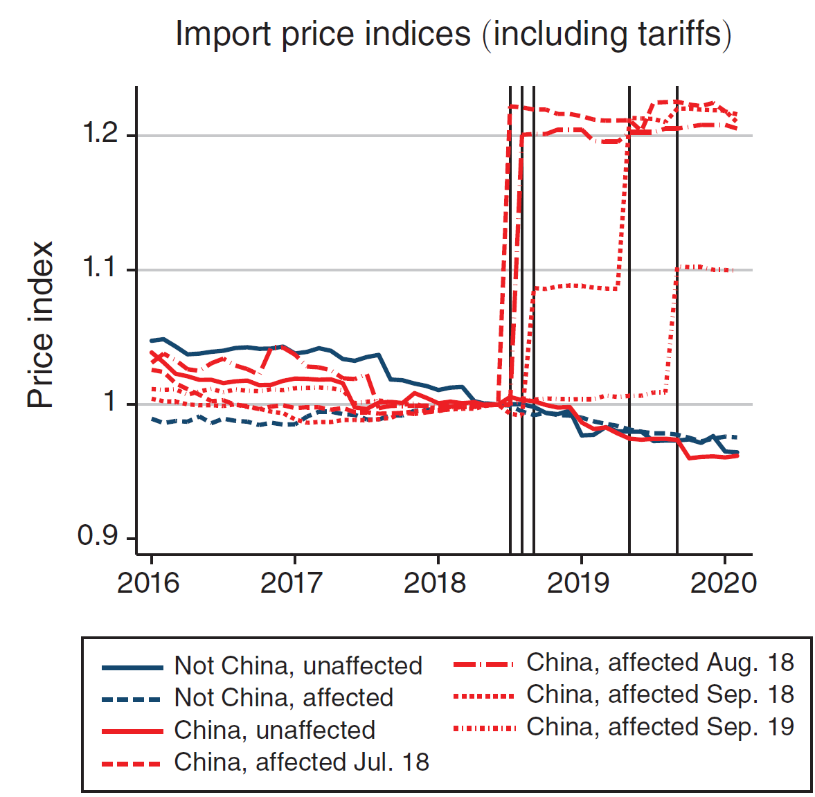 Source: “ Tariff Pass-Through at the Border and at the Store: Evidence from US Trade Policy” By Alberto Cavallo, Gita Gopinath, Brent Neiman, and Jenny Tang. AER: Insights 2021, 3(1): 19–34 https://doi.org/10.1257/aeri.20190536